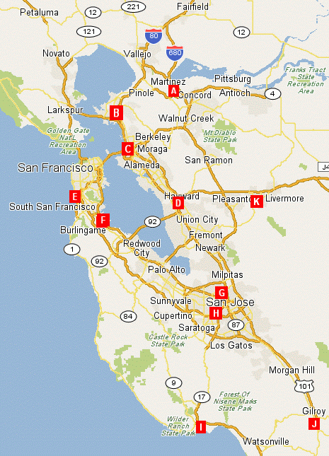 | The map to the right shows the location of all the bay area casinos, to give you some idea of distances and relative locations of them. On the map, one inch equals about 15 miles.